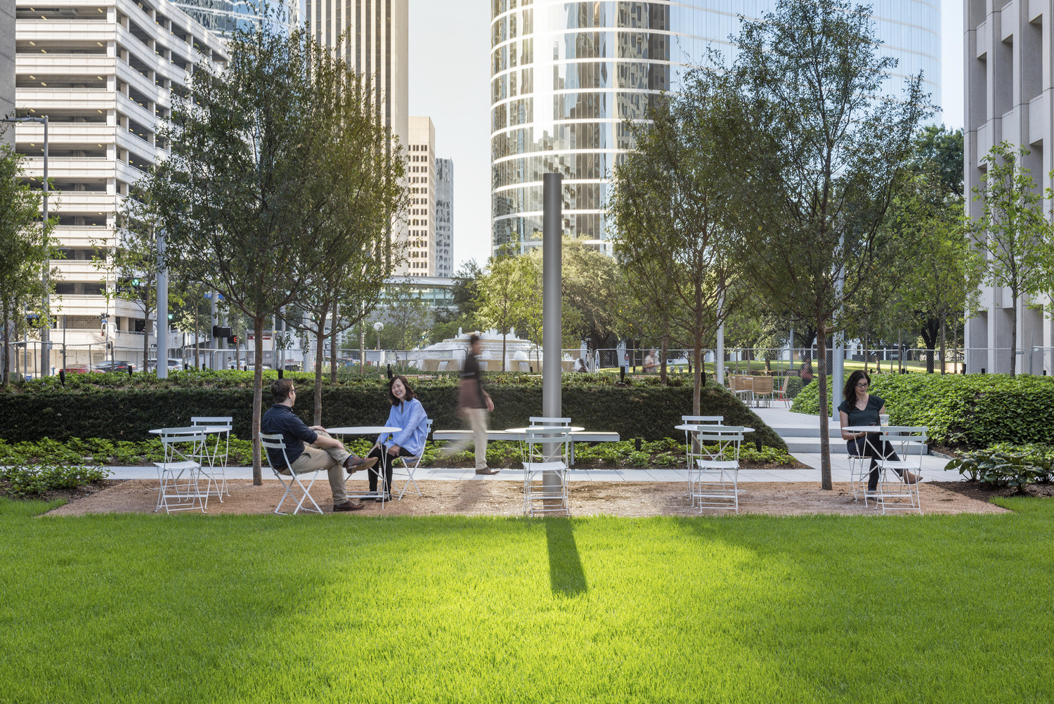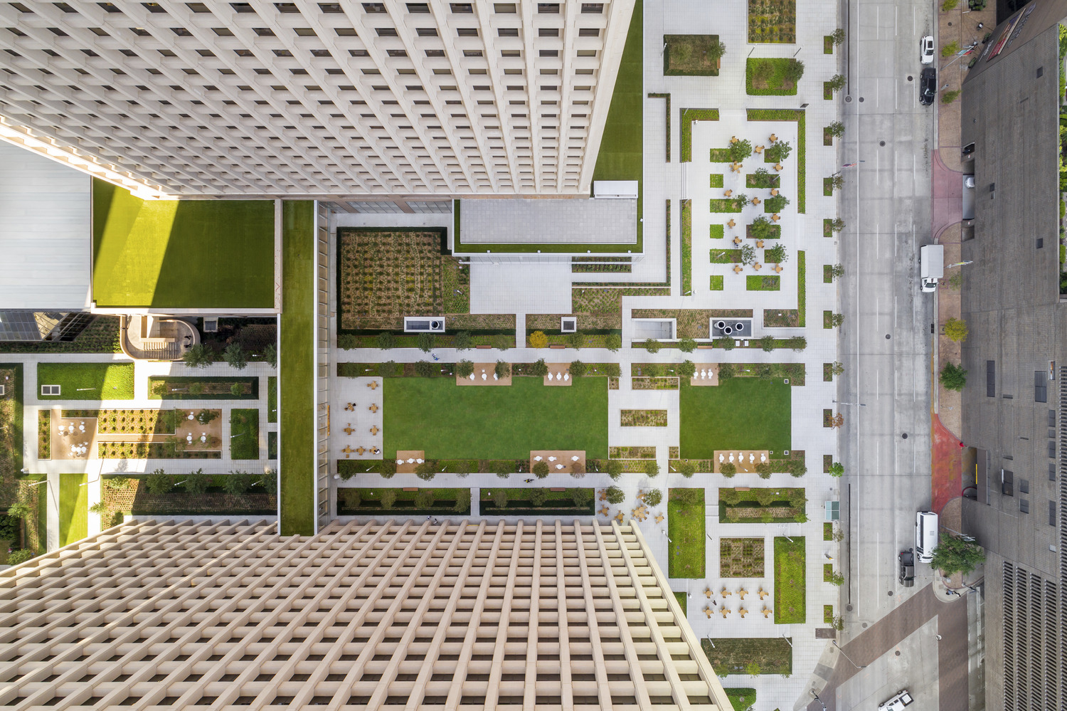 When designing The ACRE, OJB accounted for environmental sustainability, saving trees and adding additional native and adaptive tree species to provide generous shade to the site. The promenade surrounding the lawn uses light grey colored pavers, which reduce solar energy retention and minimize the impact on microclimates and habitats.