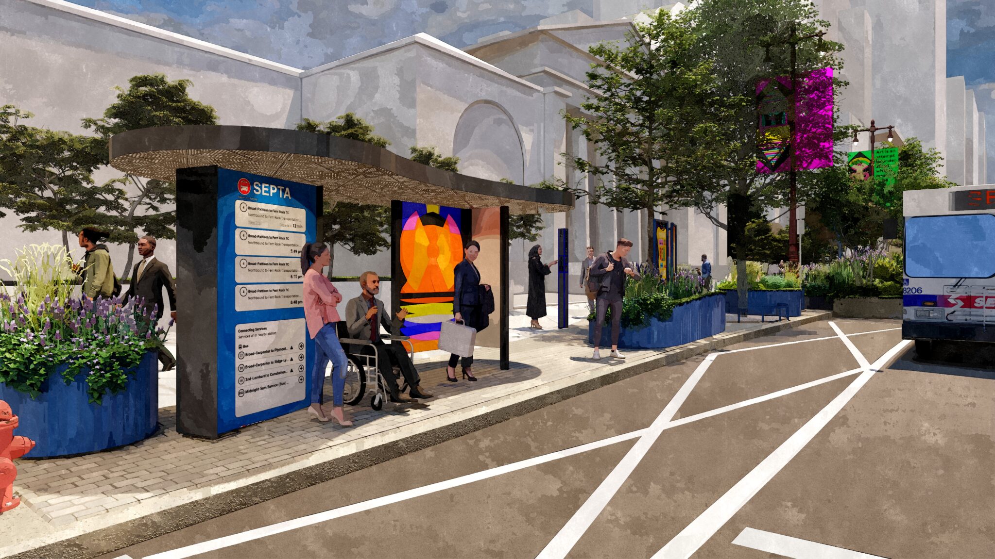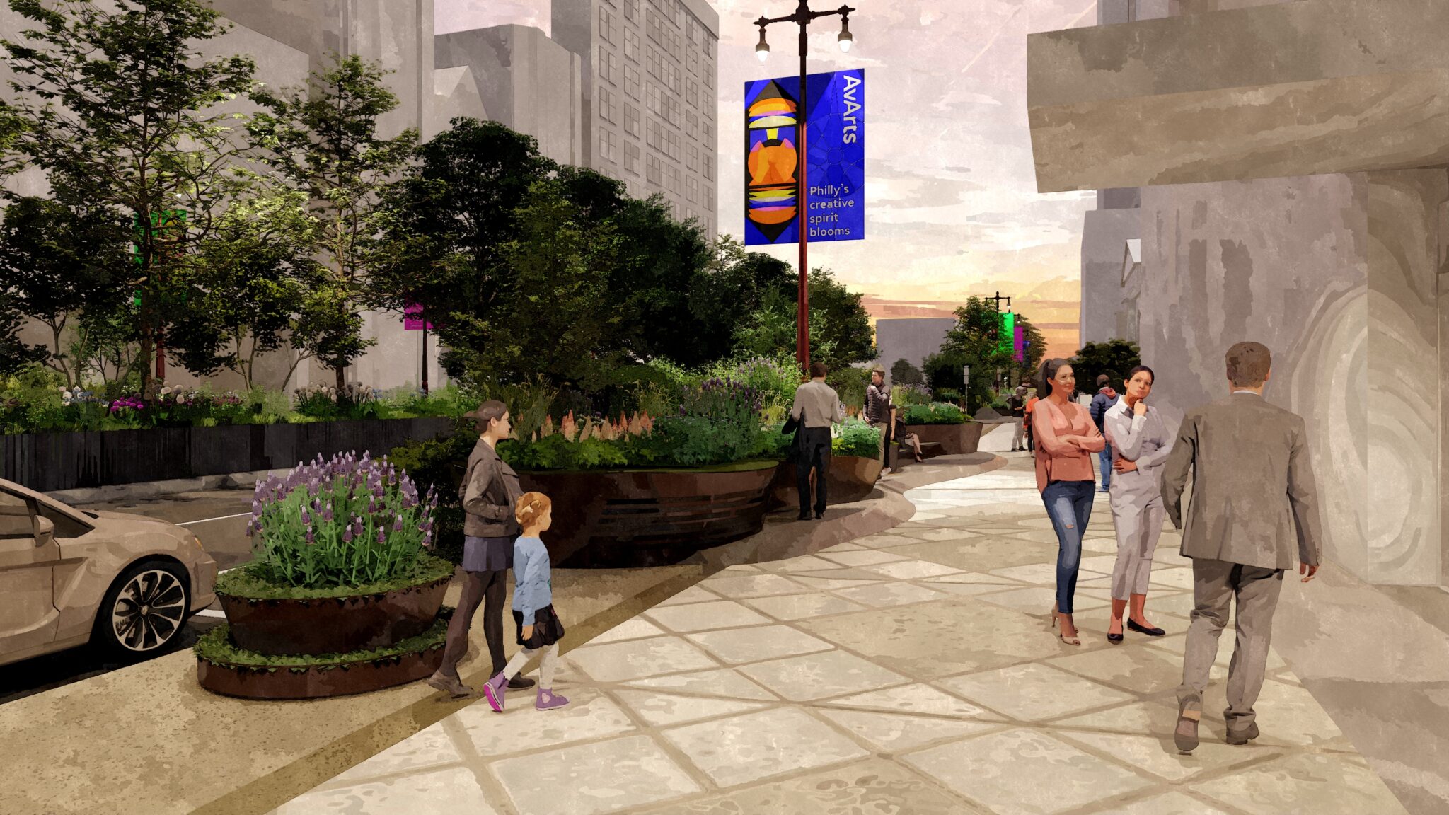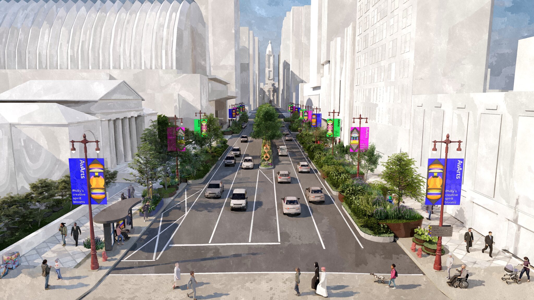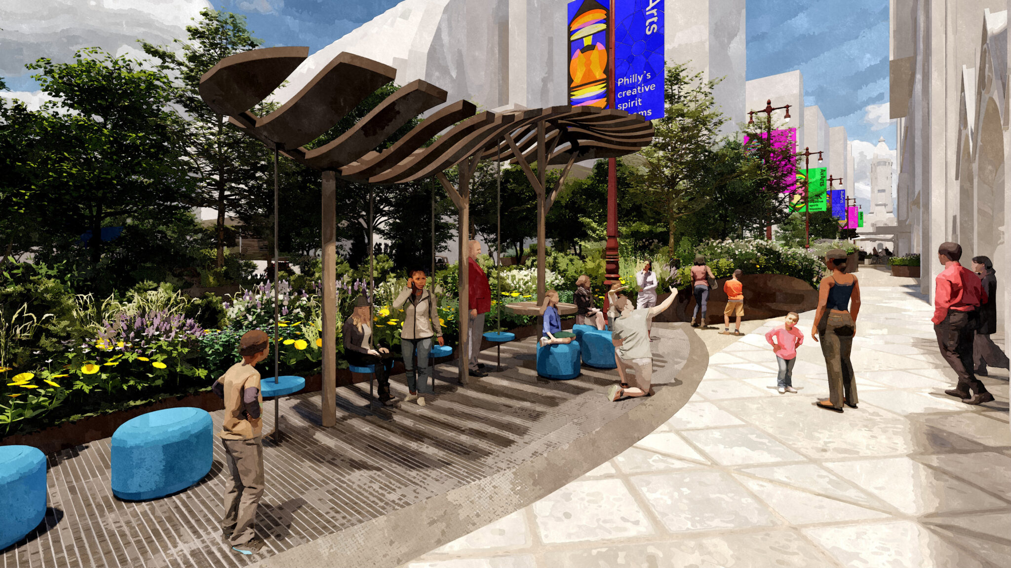 Avenue of the Arts refers to the stretch of South Broad Street between Philadelphia’s City Hall and Washington Avenue, home to the city’s premier performing arts district. The project aims to reimagine this prominent corridor as a vibrant 10-block destination featuring lush greenery, art installations, performance spaces, and inviting seating areas.