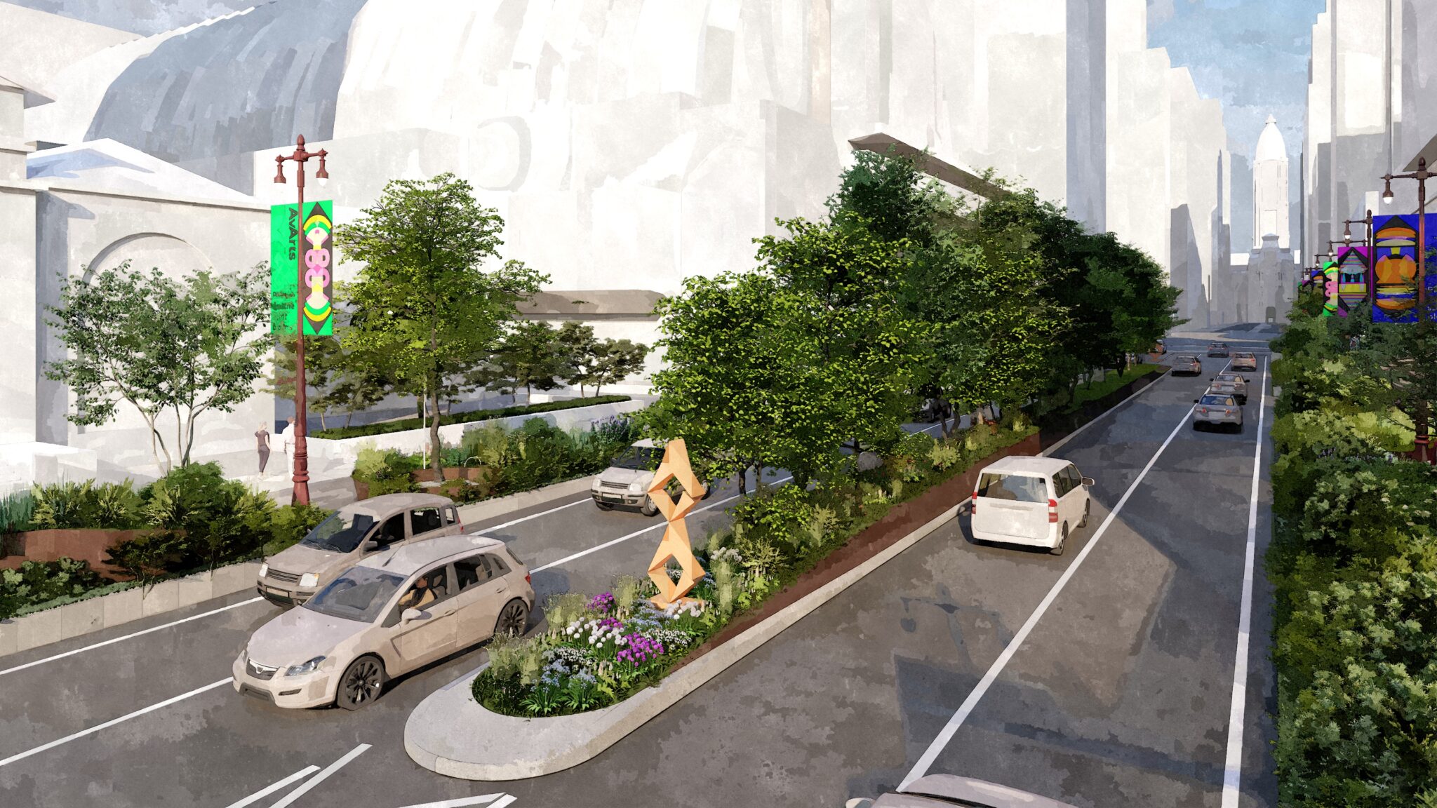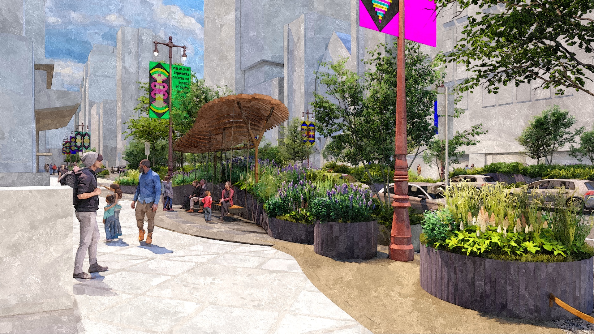 In addition to planting, the pilot block proposes new signage and wayfinding, bus shelters, street furniture, sculptures, and interactive elements.