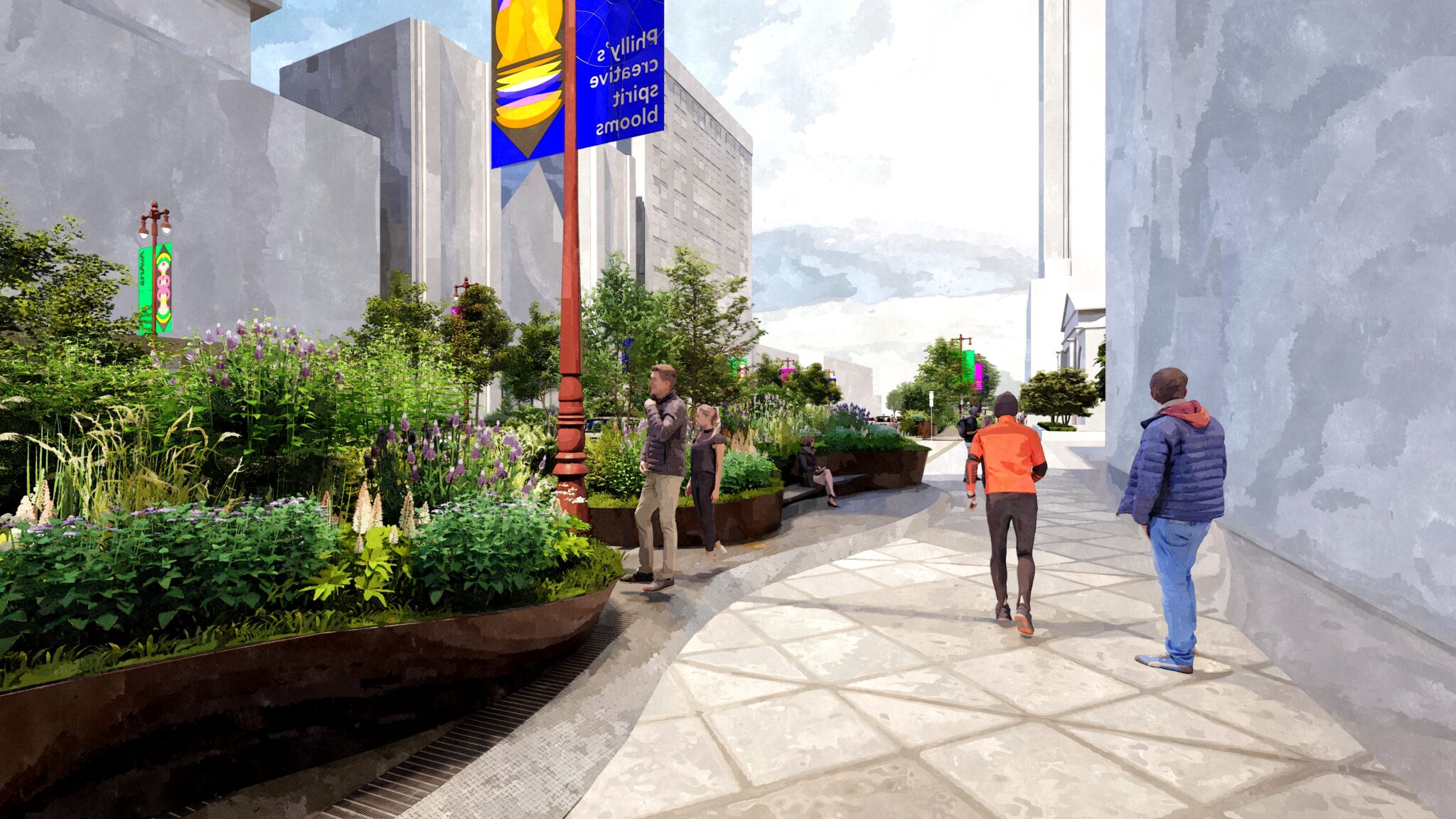 Phase 1A focuses on enhancing and introducing landscape to the central street median, and Phase 1B focuses on sidewalk improvements. The project will be implemented one block at a time as funding becomes available, totaling a $100 million investment in Philadelphia’s public realm.
