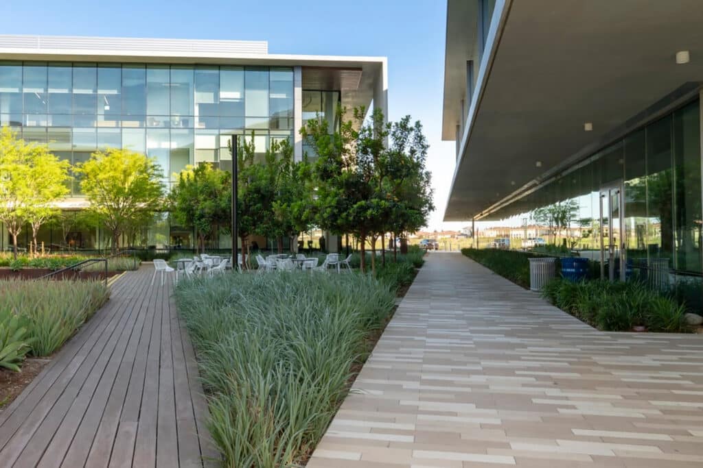 The towers are reclad and reimagined, along with a visionary transformation of the existing landscape into a vibrant, environmentally focused workspace. Spread across five acres, the lush greenspace integrates with the surrounding city with a network of meandering pathways that emphasizes connectivity. Diverse outdoor areas for work and socialization are carefully inserted into the landscape to offer privacy and respite. Terraces, AV-enabled outdoor workstations, and meeting pods allow occupants to move seamlessly between indoor and outdoor environments. This emphasis on flexible, technology-enhanced outdoor spaces highlights the temperate California climate and reflects a new attitude toward work-life balance.