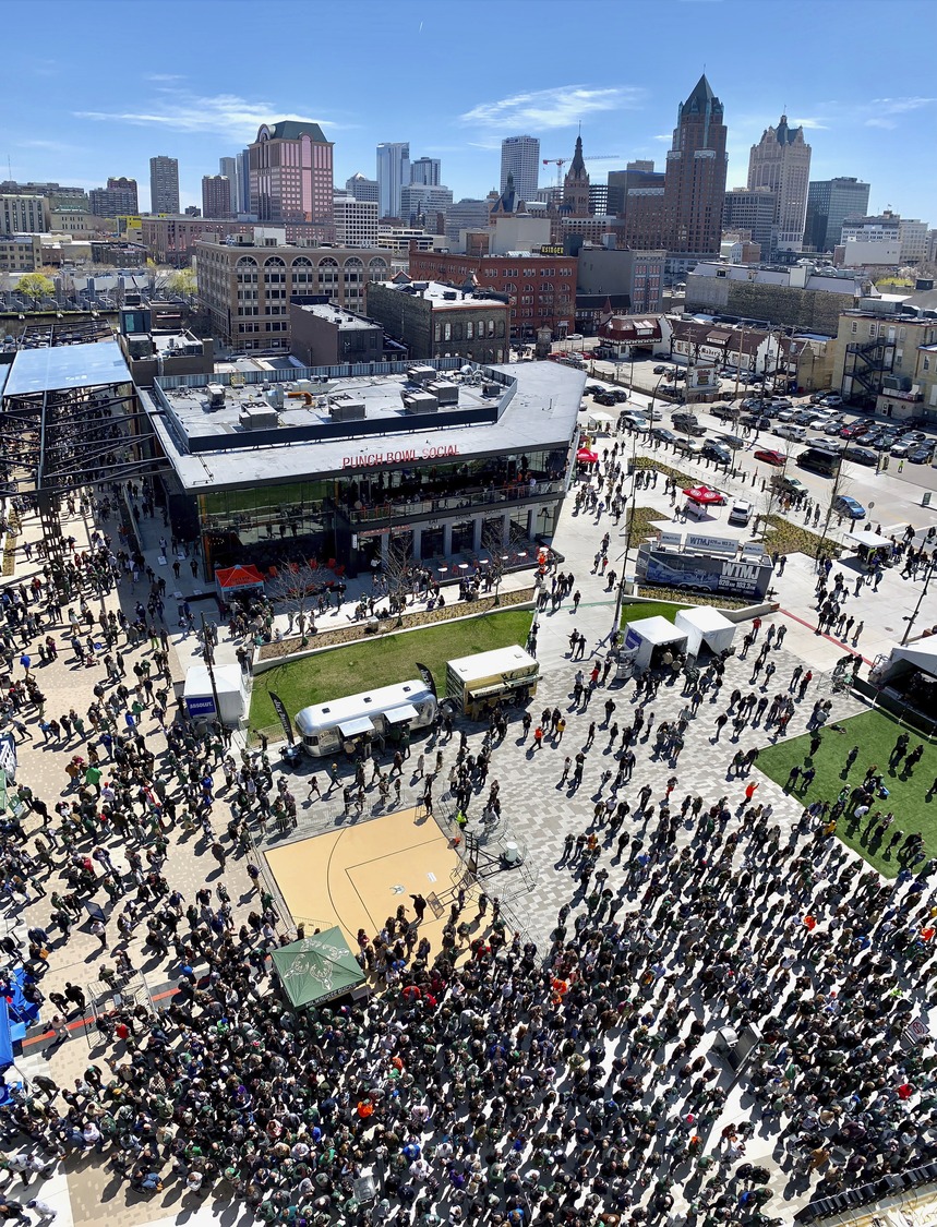 Located adjacent to Fiserv Forum—home of the Milwaukee Bucks— and between Milwaukee’s historic breweries. A linear Beer Garden connects Old World 3rd Street to the Central Plaza. A small performance stage, wood-decked bleacher seating and an artificial lawn offer ping-pong tables, corn-hole, picnic tables and fire pits during cooler months.