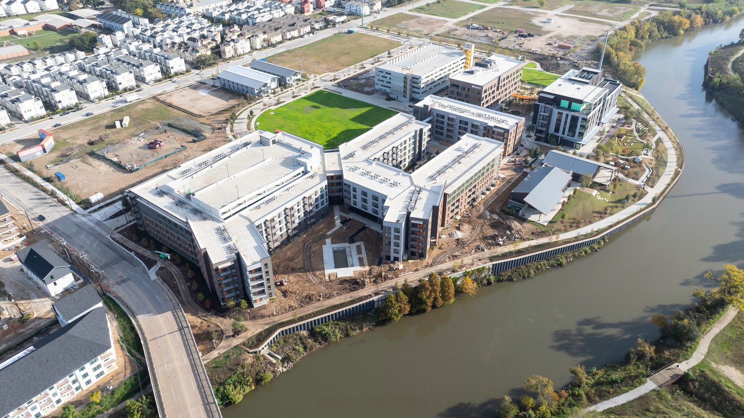 ”Dedicated bike lanes, walkable districts with wide pedestrian streetscape and open space connectivity link the surrounding neighborhoods to the site and to the bayou trail network.