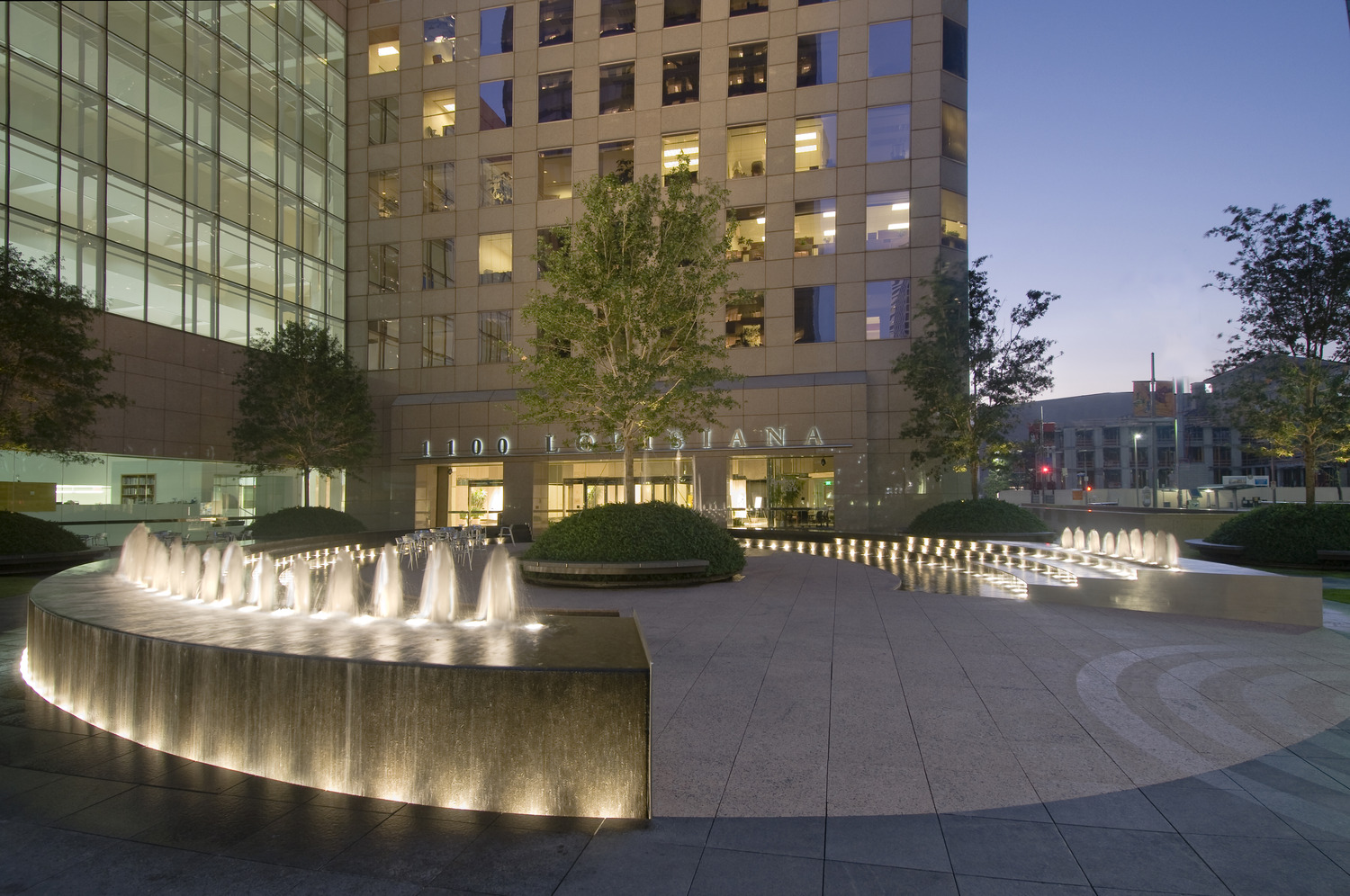 A large elliptical fountain basin defines both the primary function space and the main pedestrian path to the entry. The fountain features a series of overflowing basins, concentric rings of bubblers, and a focal with a choreographed display of jets shooting up to 20′ in the air. Custom-designed planting structures accommodate mature oak trees, provide seating, and conceal LED accent lighting. Movable furniture at the Plaza provides additional flexibility as the needs of site users change throughout the day.
