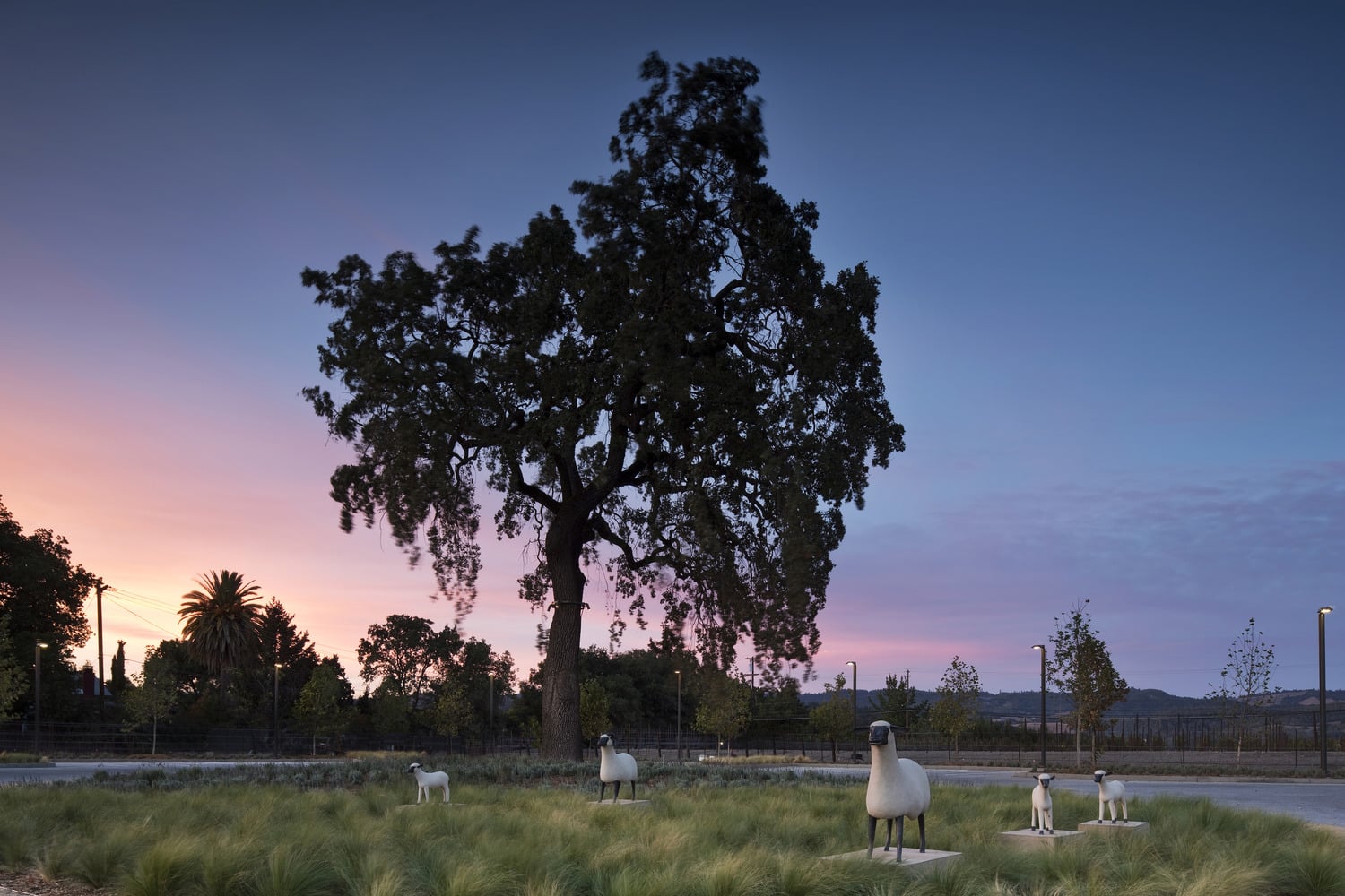 Low, crisp limestone walls and bermed planting draw visitors from Highway 29 to the interior of the site, where a sinuous lane planted with grasses leads into the parking area and around an island anchored by a preserved valley oak surrounded by grasses and lavender. Rounding this island gives visitors a glimpse of the entire composition of historic and new buildings, together with long vistas to the garden areas. The curving entrance road also separates cars from the buildings and gardens to encourage relaxation and exploration of the entire grounds before and after the tastings.