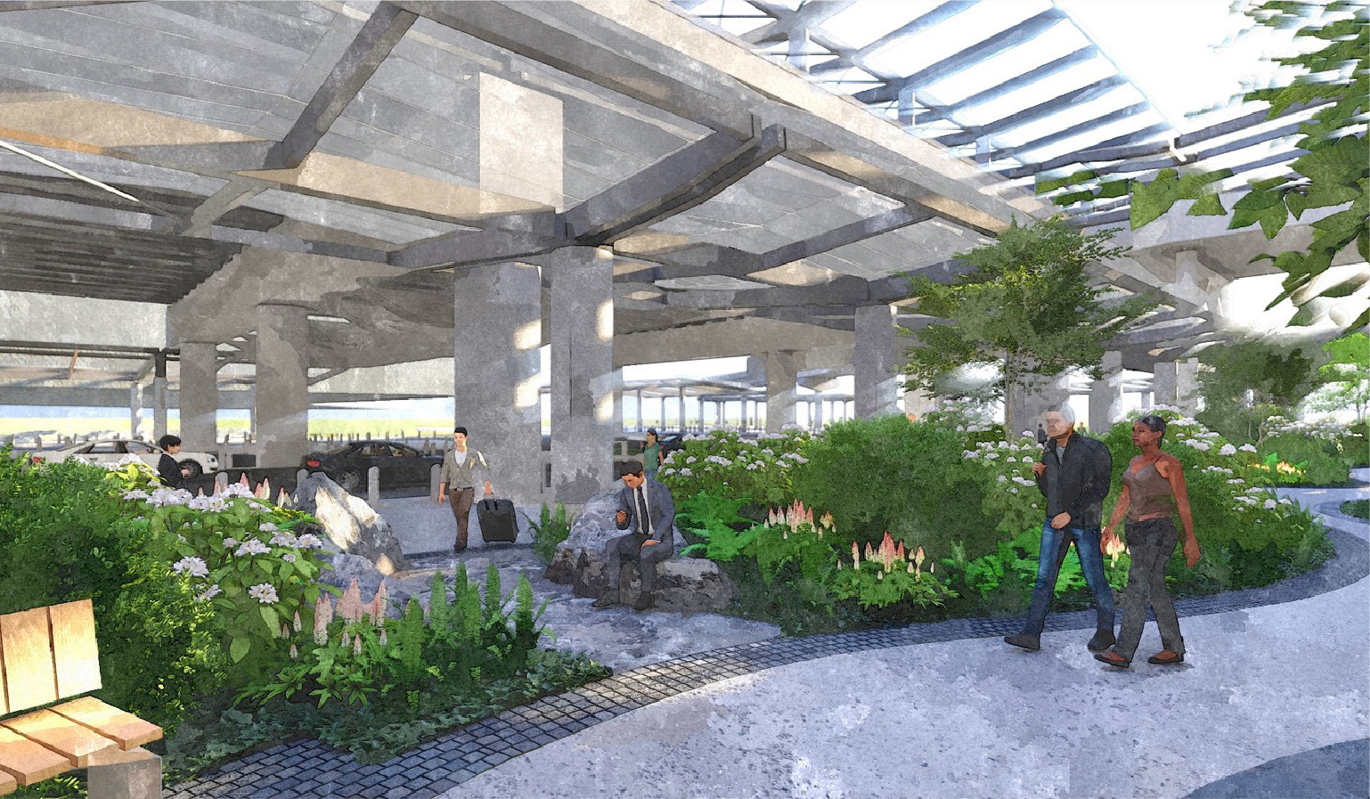 ”Infused throughout both the exterior and interior areas of the terminal, the landscape creates an immersive experience that is utilized as a wayfinding device and calming backdrop for all passengers that circulate through New Terminal One.