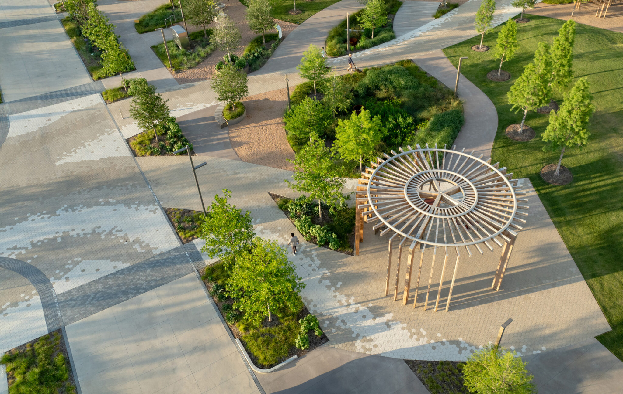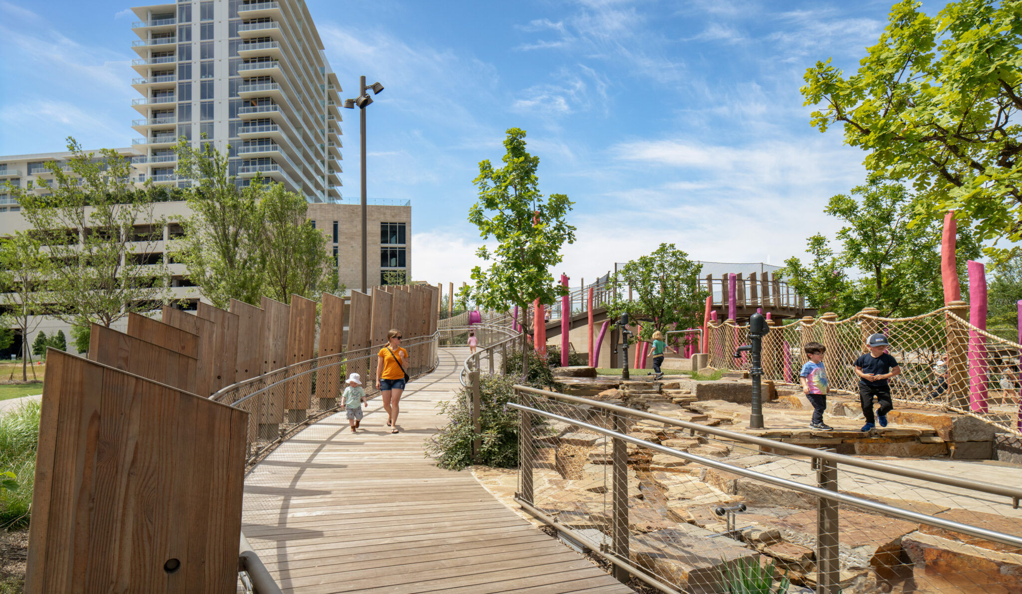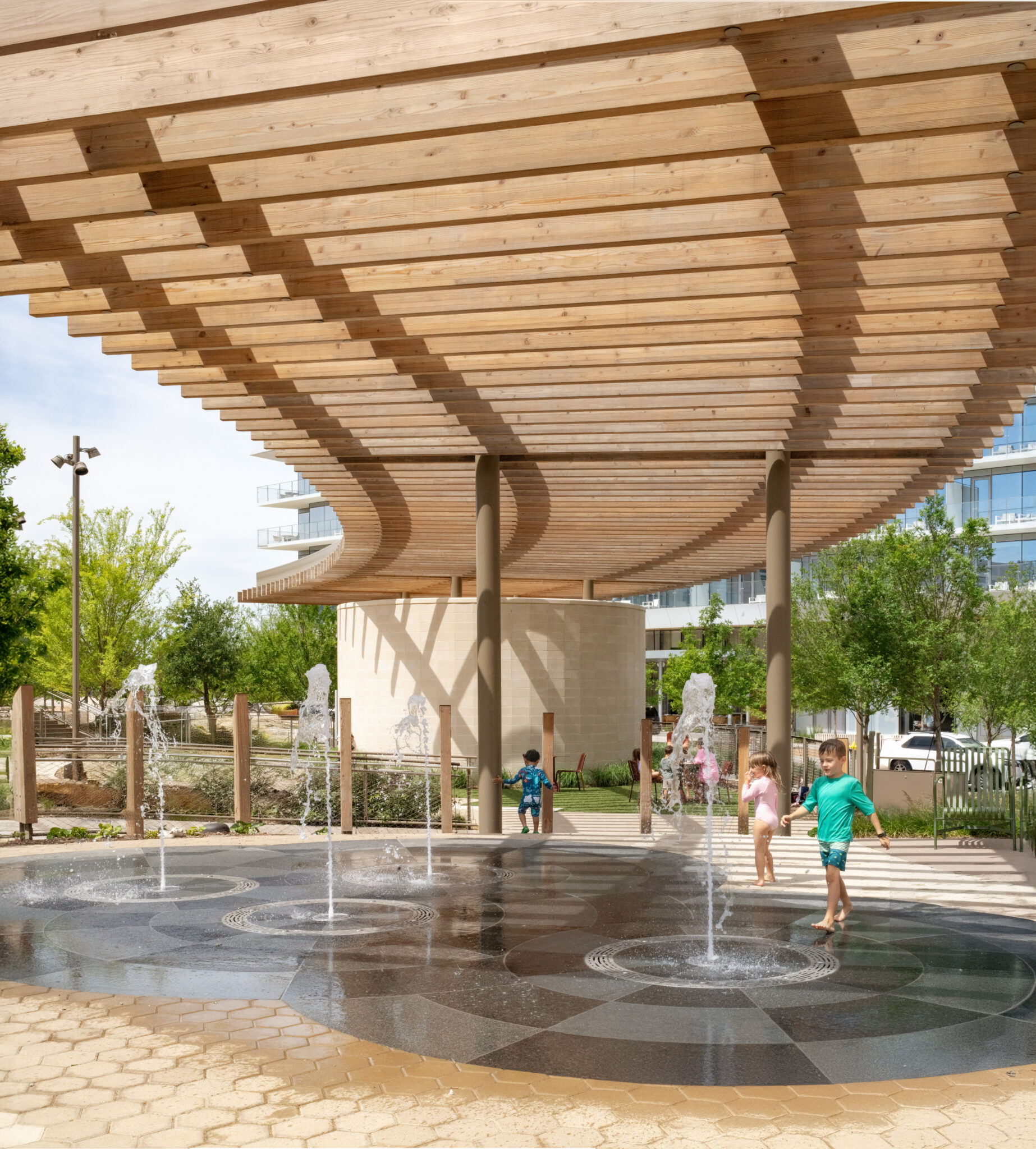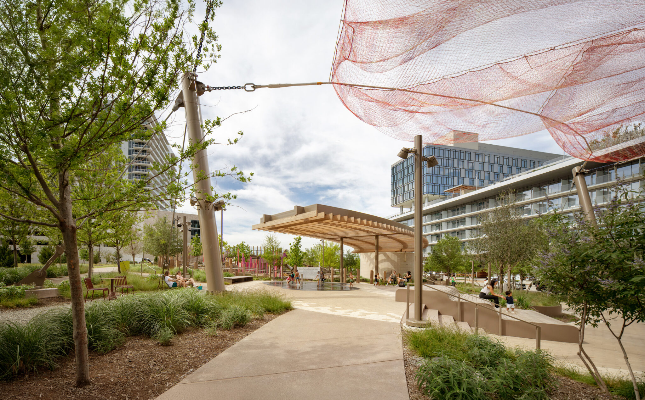 Kaleidoscope Park is the centerpiece of the larger Hall Park development in Frisco, Texas, designed as a comprehensive ecosystem of buildings and landscape across 162-acres that bring people together against a backdrop of vibrant parks and open space.