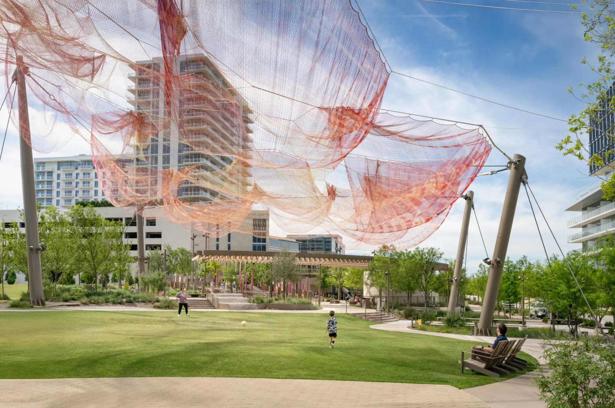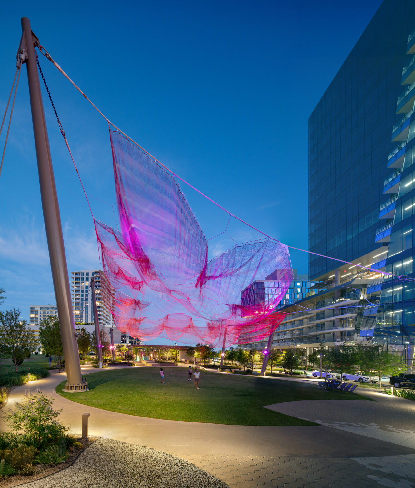 ”An installation by acclaimed fiber artist Janet Echelman floats above the park's large event lawn. Called "Butterfly Rest Stop," the piece is an homage to the millions of monarch butterflies that migrate through Frisco each fall.