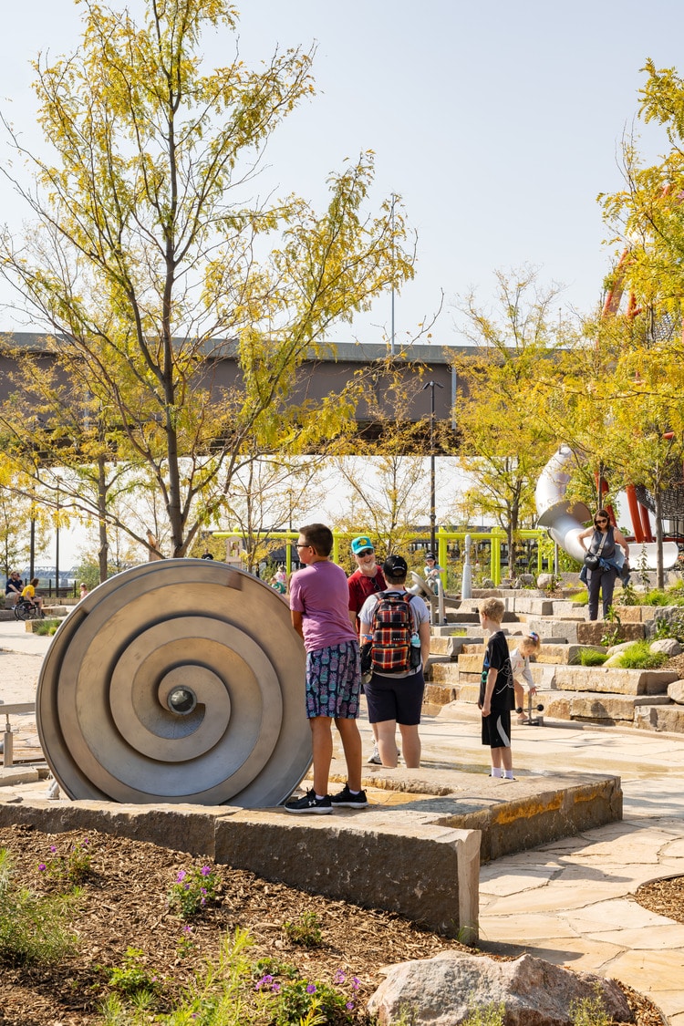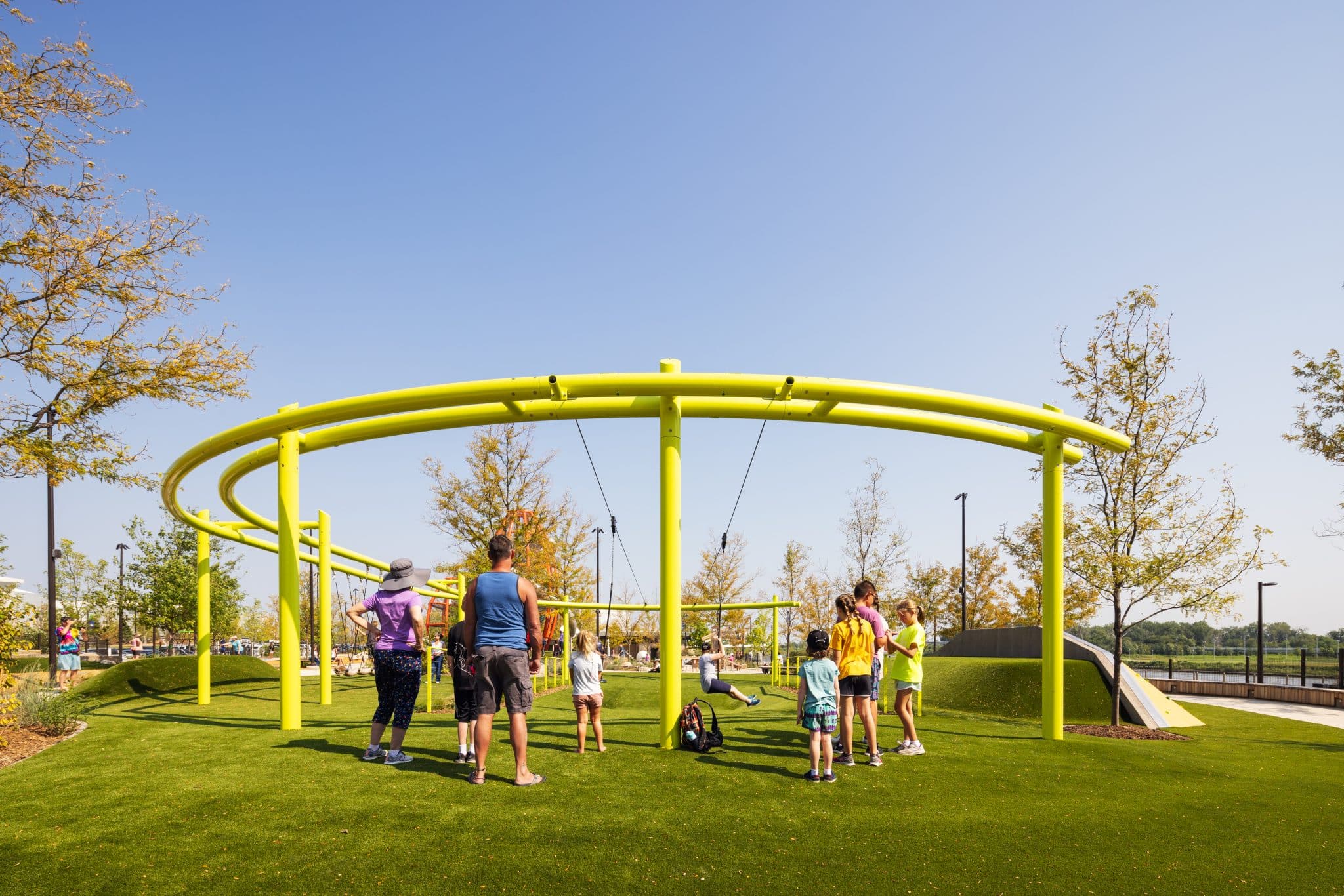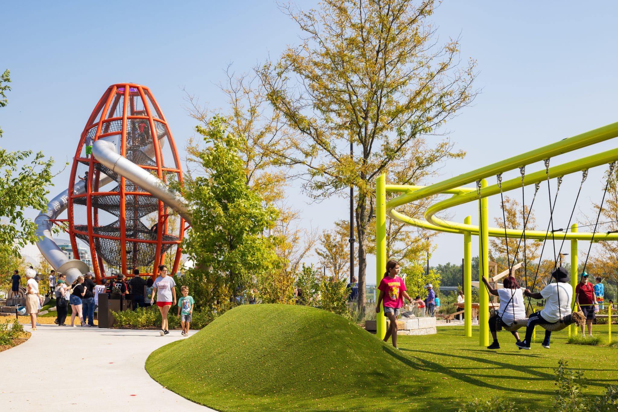 An adventure playground anchors the south end of the site, with towering climbing structures, an adventure path, zipline, log forest, swing canopy, and an interactive water/sand play area. An urban beach with seating hides the floodwall. Residents can enjoy a day at the beach with volleyball, lounging, bocce ball, and a full view of the previously obscured Missouri River. The park is further anchored by the Luminarium, a STEM museum that dovetails with educational programming and adventure play paths. The connective site areas along the rail lines, roadways and River are planted with low-maintenance prairie grasslands, which offer seasonal interest and will naturalize over time.
