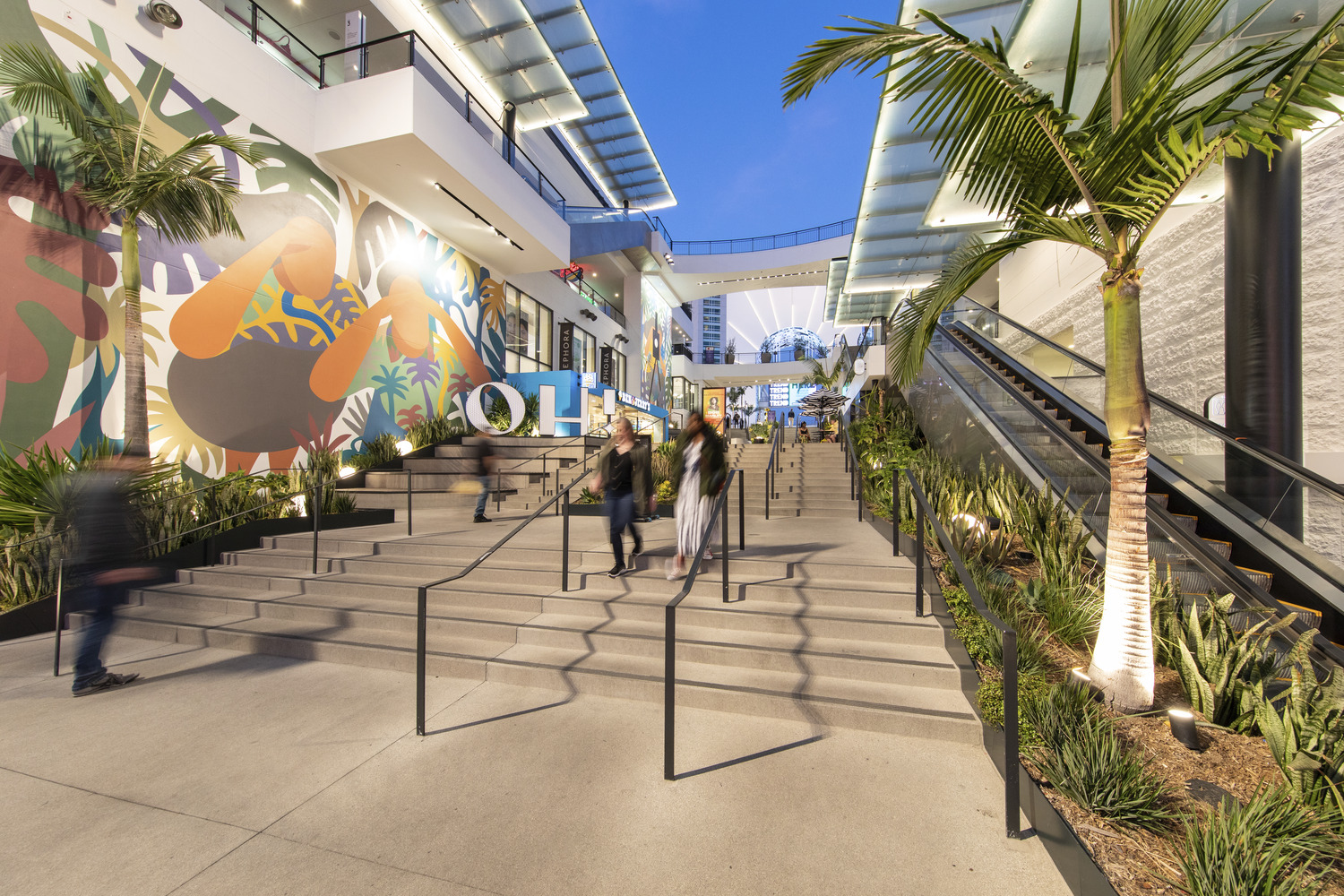 A grand stair takes visitors from Hollywood Boulevard to the main public realm, featuring an urban plaza. This activated central plaza reenergizes the heart of the project into a hub of culture and entertainment, becoming a place for tourists, employees, and nearby residents to gather. Additional outdoor spaces feature lush landscaping and provide plenty of opportunities to dine and linger at the open-air center. Observation decks also offer views of the city and the Hollywood sign.