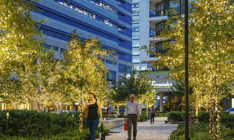 A central urban plaza is enlivened with a performance stage and an interactive water feature. An open-air pavilion is the defining backdrop to the stage and provides shaded seating for users. The central lawn is the heart and social center of the development, hosting activities throughout the day and after-hours. A decomposed granite dining court provides an alternative seating space that welcomes all, with fixed benches, and moveable cafe tables and chairs, under a graceful canopy of trees.